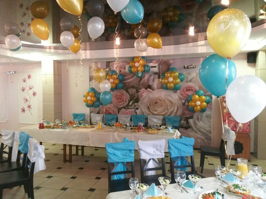 • Под потолком банкетного зала часто развешиваются шарики разного размера. Такой декор придаёт помещению эффектные черты, благодаря чему, праздник получается ещё более ярким. В приоритете — использование контрастных оттенков, чтобы помещение выглядело нарядно и пафосно.