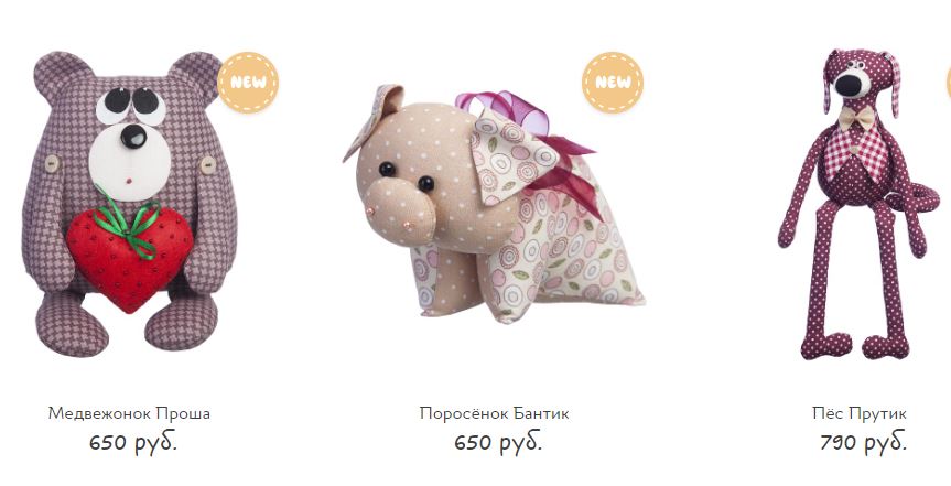 1. Наборы для шитья мягких игрушек и кукол. Купив все необходимые компоненты, сможет изготовить мягкую игрушку даже ребенок. В состав таких наборов входят разные комплектующие — пуговицы, ткани, фетр, бусины, ленты, игла для бисера, нитки для декора и прочие составляющие элементы. К заказу доступны наборы с названиями «Кошечка Марта», «Пёс Пятнашка», «Медвежонок Проша», «Лягушонок Ластик» и прочие товары. К каждому набору указана стоимость и описание на странице. В составе комплекта имеется выкройка и подробная инструкция по изготовлению, упрощающая процесс шитья.
