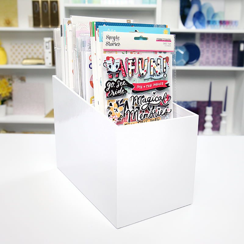Еще один отличный и доступный вариант хранения — наш высокий органайзер для наклеек. Если вы любите наклейки 6х12 так же, как и мы, то это просто необходимая вещь в вашем творческом пространстве! Наклонная конструкция позволяет легко организовать запас наклеек. Он изготовлен из сверхтолстого серого картона, завернутого в прочную белую глянцевую бумагу! Вы будете поражены тем, сколько наклеек можно хранить в высоком органайзере для наклеек!