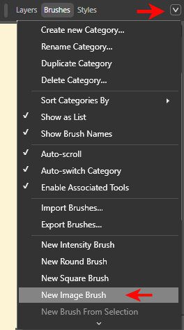 Я превращу этот логотип в кисть изображения.Откройте панель Кисти и щелкните маленькую стрелку в правом верхнем углу.Затем выберите Новая кисть изображения .
